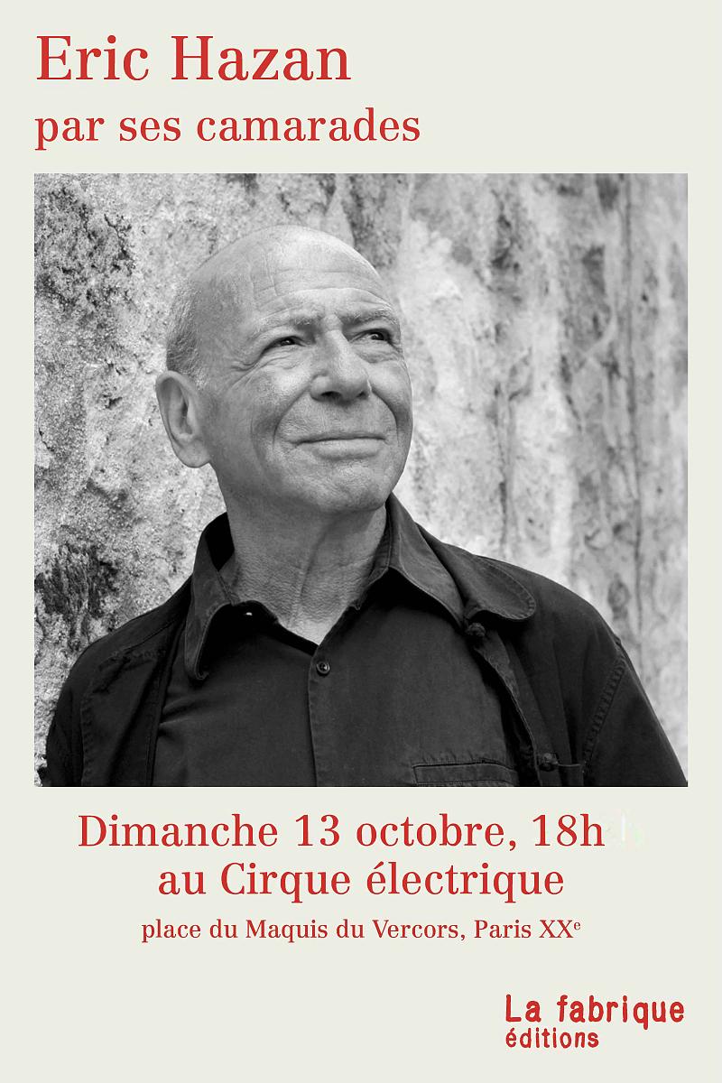Hommage à Éric Hazan (1936-2024) le dimanche 13 octobre 2024 à 18 heures au Cirque électrique (place du Maquis du Vercors, 75020 Paris).